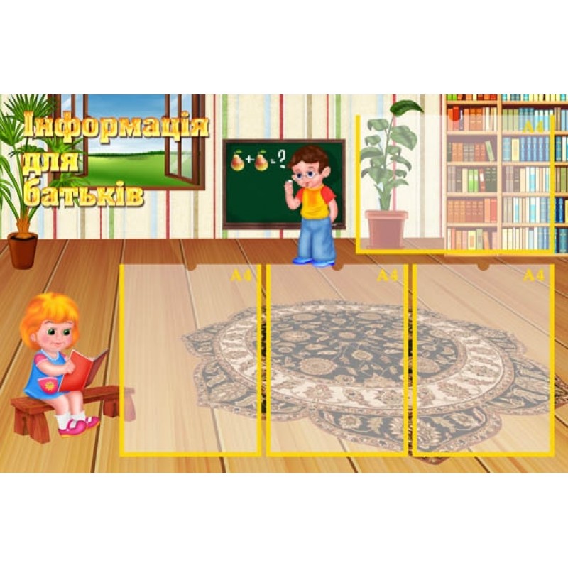 Характеристики виробу: основа - ПВХ 3 мм з накаткою самоклейкої плівки з друком зображення роздільною здатністю 1440 dpi. 4 пласкі кишені формату А4