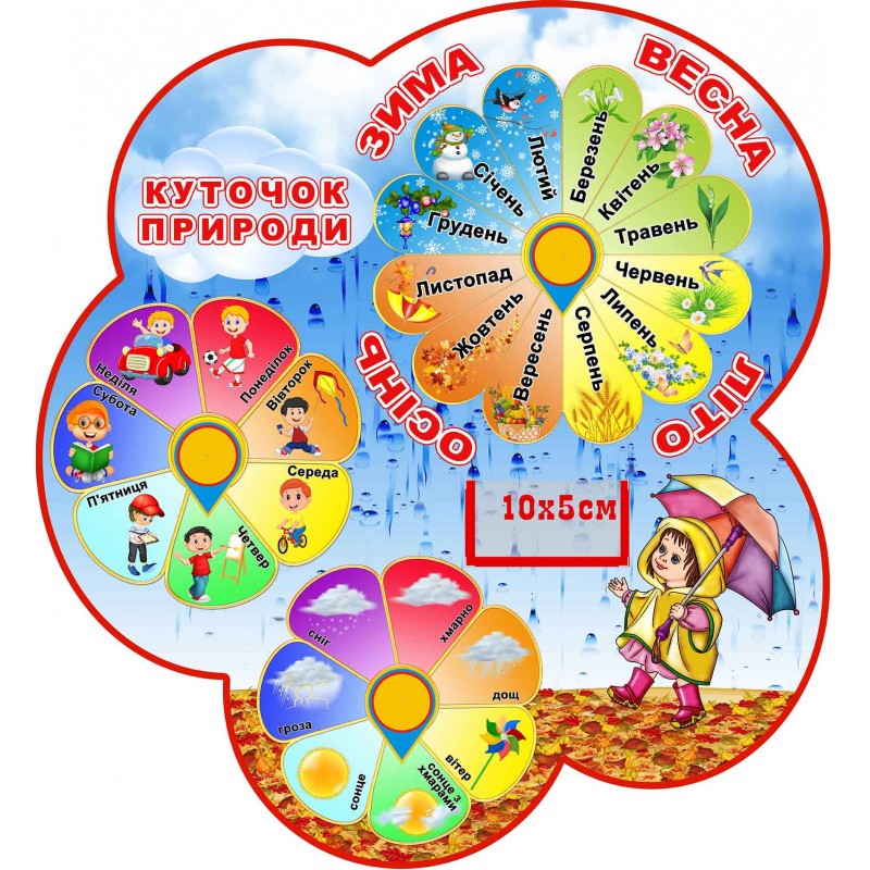 Стенд "Календар природи" на українській мові призначений для отримання необхідних знань з метою формування уявлень про оточуючий світ, різноманітні погодні явища, розвитку уваги, пам`яті, відповідальності, підвищення загального інтелектуального рівня та бажання пізнати більше. За допомогою стенду діти можуть вивчити пори року та місяці, дні тижня. Крім того є можливість відмічати погоду, яку діти спостерігають.