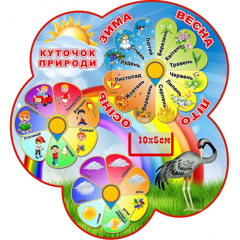 Стенд "Календар природи" на українській мові призначений для отримання необхідних знань з метою формування уявлень про оточуючий світ, різноманітні погодні явища, розвитку уваги, пам`яті, відповідальності, підвищення загального інтелектуального рівня та бажання пізнати більше. За допомогою стенду діти можуть вивчити пори року та місяці, дні тижня. Крім того є можливість відмічати погоду, яку діти спостерігають.