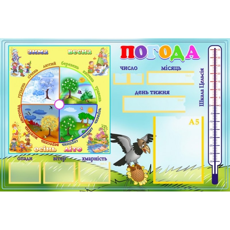 Стенд "Погода" на українській мові призначений для отримання необхідних знань з метою формування уявлень про оточуючий світ, різноманітні погодні явища, розвитку уваги, пам`яті, відповідальності, підвищення загального інтелектуального рівня та бажання пізнати більше.