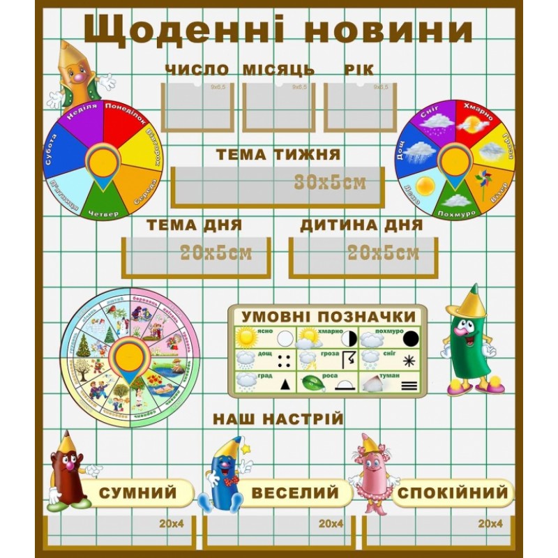 Характеристики виробу: основа - ПВХ 3 мм з накаткою самоклейкої плівки з друком зображення роздільною здатністю 1440 dpi. 6 пласких кишень під карточки з прозорого пластику ПЕТ 0,75 мм (кріплення на двобічний скотч), стрілки з ПВХ, рухлива. 3 кишені під визначення настрою