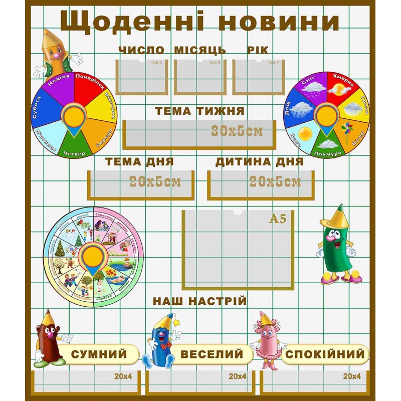 Характеристики виробу: основа - ПВХ 2 мм з накаткою самоклейкої плівки з друком зображення роздільною здатністю 1440 dpi. 1 пласка кишеня формату а5, 3 пласкі кишені формату 20*4см, 2 пласкі кишені формату 20*5см, 3 пласкі кишені формату 9*6,5см, 1 пласка кишеня формату 30*5см, 3 рухливі стрілки