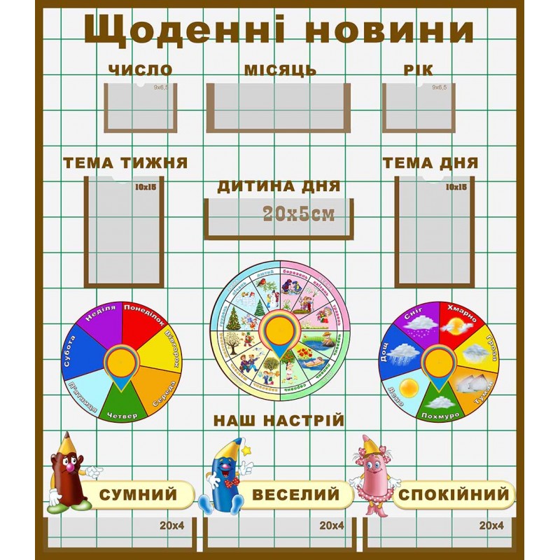 Характеристики виробу: основа - ПВХ 2 мм з накаткою самоклейкої плівки з друком зображення роздільною здатністю 1440 dpi. 3 пласкі кишені формату 20*4см, 2 пласкі кишені формату 10*15см, 3 пласкі кишені під дату, 1 пласка кишеня формату 20*5см, 3 рухливі стрілки.