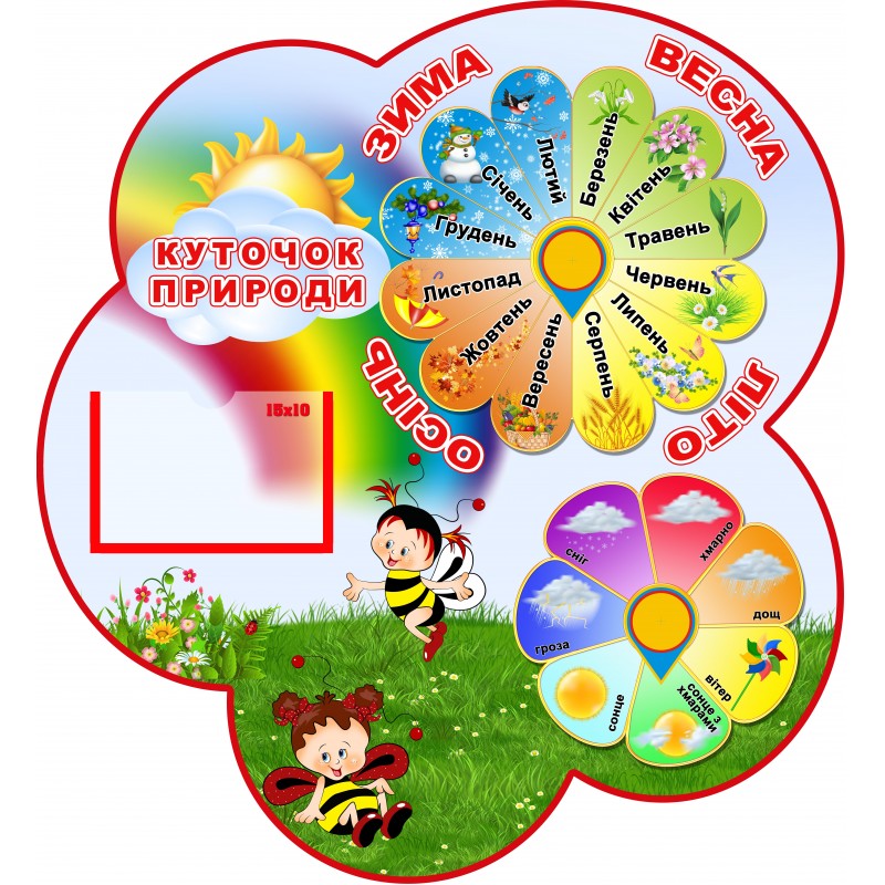 Стенд "Календар природи" на українській мові призначений для отримання необхідних знань з метою формування уявлень про оточуючий світ, різноманітні погодні явища, розвитку уваги, пам`яті, відповідальності, підвищення загального інтелектуального рівня та бажання пізнати більше. За допомогою стенду діти можуть вивчити пори року та місяці, дні тижня. Крім того є можливість відмічати погоду, яку діти спостерігають.