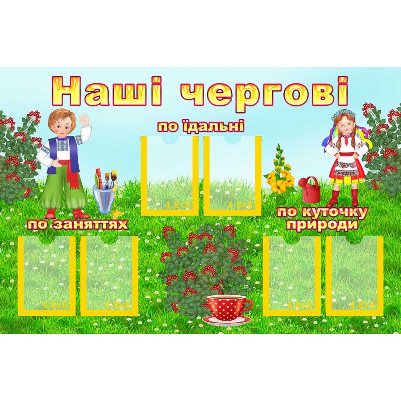 Характеристики виробу: основа - ПВХ 3 мм з накаткою самоклейкої плівки з друком зображення роздільною здатністю 1440 dpi. 6 пласких кишень формату 48*80 мм (кріплення на двобічний скотч)
